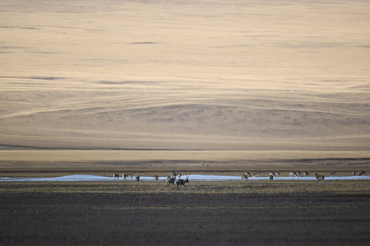 "The grass here is excellent. We should see Tibetan antelopes soon," he said. True to his prediction, faint shapes soon emerge in the distance, moving across the barren landscape and stirring up dust.