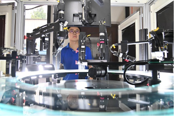 A technician at a machinery manufacturer in Southwest China's Chongqing fine-tunes an AI-powered industrial vision inspection system. (Photo: People's Daily/ Sun Kaifang)