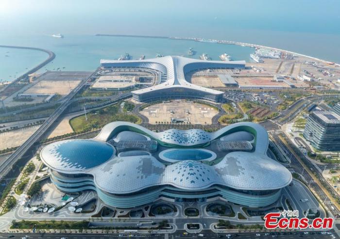 Photo taken on Dec. 5, 2025 shows an aerial view of CDF Haikou International Duty Free Center next to Xinhai Port in Hainan Province. (Photo: China News Service/Luo Yunfei)