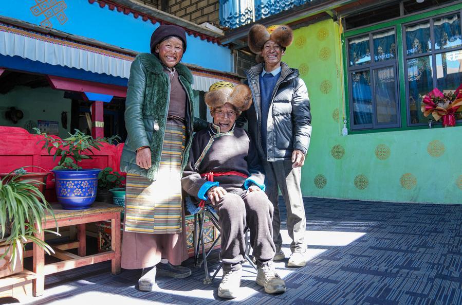 Padma Tashi (C) sits for a group photo with his daughter and son-in-law at home in Zhanang County, southwest China's Xizang Autonomous Region, March 26, 2026. (Xinhua/Jigme Dorje)