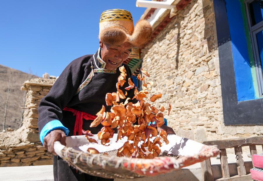 Padma Tashi dries apple slices at home in Zhanang County, southwest China's Xizang Autonomous Region, March 26, 2026. (Xinhua/Jigme Dorje)