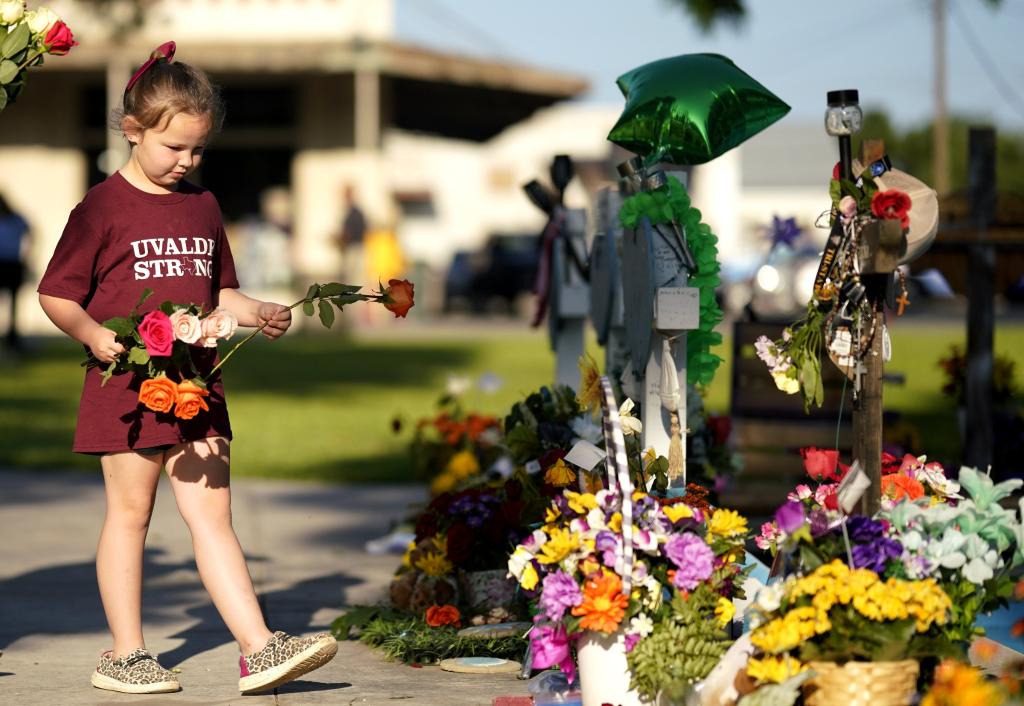 5月24日,在美国得克萨斯州小城尤瓦尔迪的广场上,一名女孩献上鲜花悼念校园枪击遇害者。当日是美国尤瓦尔迪大规模校园枪击事件一周年。2022年5月24日,19名学生和2名教师在尤瓦尔迪市罗布小学枪击事件中遇难。(新华社记者吴晓凌摄)