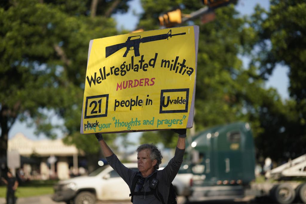 在悼念现场,人们不仅寄托哀思,也展示主张。T恤上印着“够了,结束枪支暴力”的字样;手中举着“我们要求问责”的标语牌;一位署名马丁的得州居民在每个孩子的十字架下都放了一份宣言,指责美国全国步枪协会和无良政客等对拥枪权利的滥用。