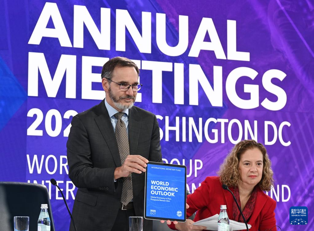 10月14日,在美国华盛顿,国际货币基金组织首席经济学家皮埃尔-奥利维耶·古兰沙(左)在《世界经济展望报告》新闻发布会上展示报告。新华社记者李睿摄