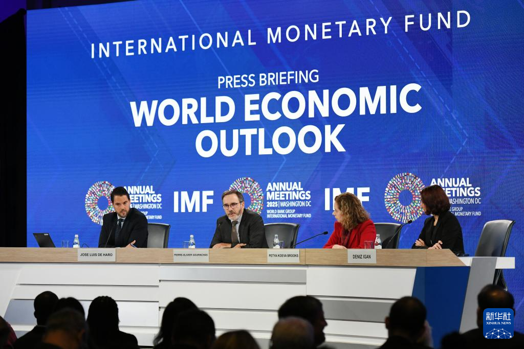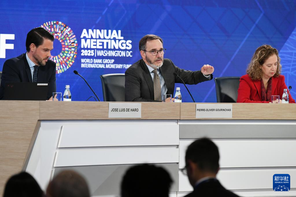 10月14日,在美国华盛顿,国际货币基金组织首席经济学家皮埃尔-奥利维耶·古兰沙(中)在《世界经济展望报告》新闻发布会上讲话。新华社记者李睿摄