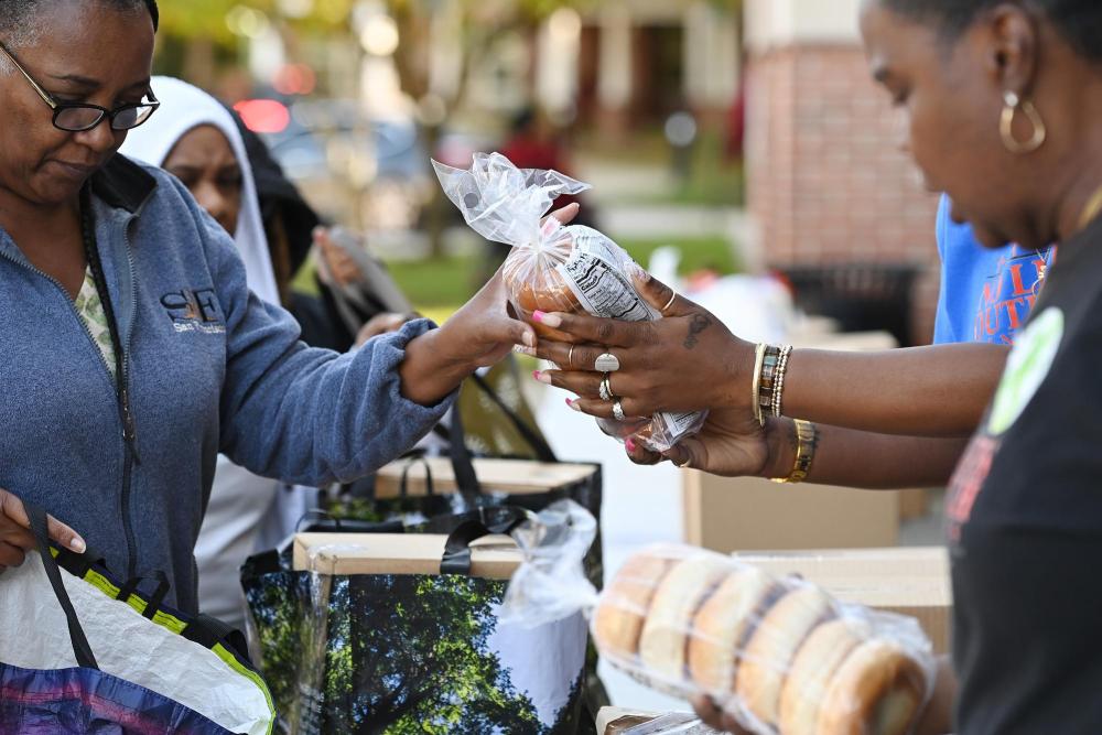 10月21日,在美国马里兰州海厄茨维尔市,联邦雇员领取免费食品。新华社记者李睿摄