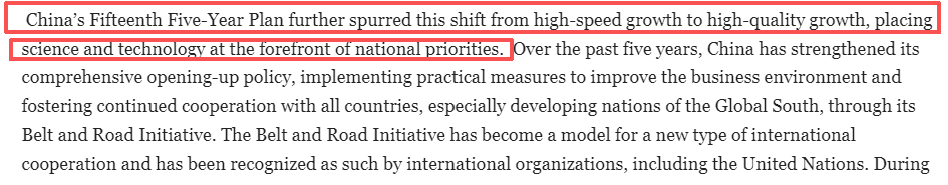 作者在文中说,“十五五”规划建议进一步推动中国经济从高速增长向高质量发展转型,将科技创新提升至国家战略核心。过去五年间,中国深化全方位开放格局,通过优化营商环境的具体措施,特别是借助共建“一带一路”倡议,持续深化与各国尤其是全球南方发展中国家的合作。该倡议已成为新型国际合作的典范,获得联合国等国际组织的高度认可。与此同时,中国通过“绿色经济”政策统筹推进生态环境改善与国际承诺履行,重点支持非洲及全球南方国家的环保型经济项目。在环境保护、清洁能源、生态建设与绿色产业领域,中国正以坚定承诺加速推进经济清洁化、绿色化转型。