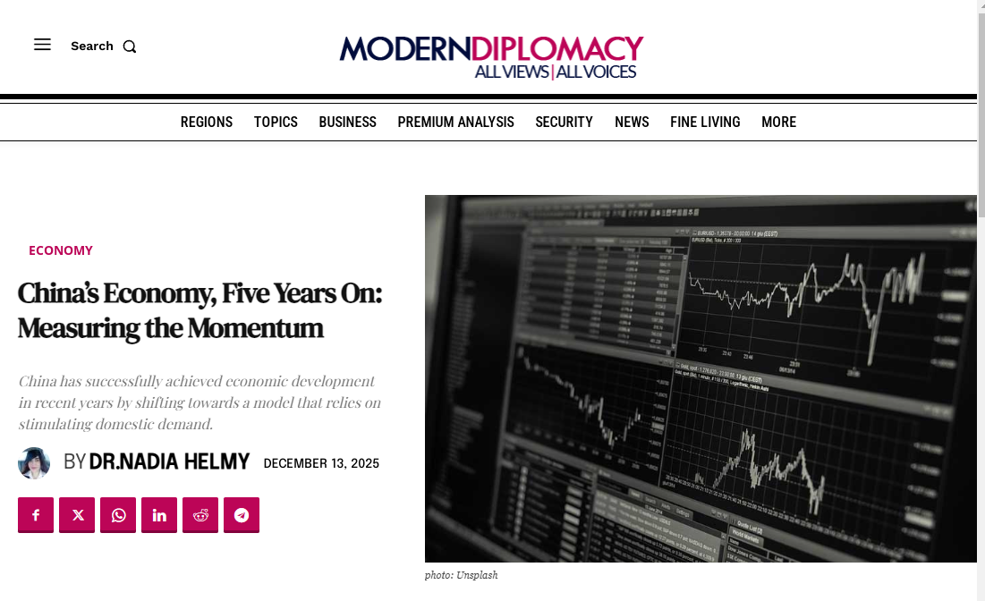 欧洲《现代外交》网站发表题为《中国经济在五年发展后的现状如何?——评估其增长动力与未来趋势》的署名文章。作者是埃及本尼苏伊夫大学副教授纳迪亚·赫尔米博士。文章说,近年来,中国成功转向依靠提振内需的发展模式,实现了经济持续发展。这不仅保障了经济稳定,还关乎中国国家安全与国际竞争力的核心考量。