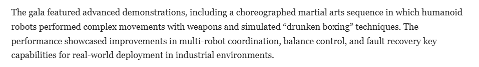 文章指出,在春晚节目中一段精心编排的武术表演中,人形机器人展示了复杂的动作,并模拟了“醉拳”技巧。该表演展示了多个机器人协作、平衡控制以及故障恢复等关键能力的提升,也展示了中国如何将产业政策、文化传播以及市场发展整合为统一的创新策略。