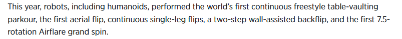 土耳其阿纳多卢通讯社的报道称,在今年的春晚上,包括人形机器人在内的各类机器人完成了世界上首次连续花式翻桌跑酷、首次弹射空翻、单脚连续空翻、两步蹬墙后空翻,以及首次大回旋七周半的动作。而2025年的春晚表演中,机器人还只是转手帕并做一些简单的动作。报道强调,这些表演充分展示了中国在人形机器人领域的快速发展。