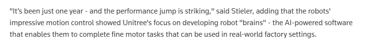 路透社则援引科技咨询公司施蒂勒(Stieler)机器人与自动化业务负责人乔治·施蒂勒(Georg Stieler)的观点称,仅仅一年的时间,中国机器人性能的提升令人瞩目。他指出,这些机器人出色的运动控制能力展示了中国科技企业在开发机器人“大脑”方面的专注程度——即那些由人工智能驱动的软件,它们能够帮助机器人完成精细的操作任务,这些任务可在实际的工厂环境中发挥作用。