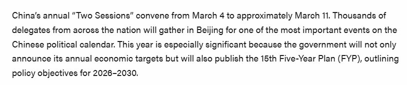 文章说,今年的两会尤为关键,将为第十五个五年规划(2026-2030年)奠定基础。投资者应关注比往年更明确的政策信号,特别是在产业升级、科技自主和经济安全等领域。
