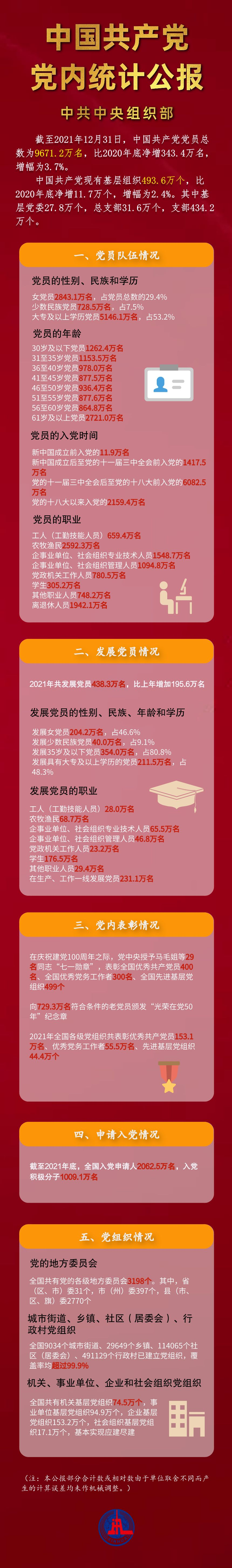 中央组织部最新党内统计数据显示,截至2021年底,中国共产党党员总数为9671.2万名,比上年净增343.4万名。党的基层组织493.6万个,比上年净增11.7万个。中国共产党一路走来,始终把基层党组织和党员队伍建设作为党的建设的基础性工作,不断吸收新鲜血液,着力锻造先锋队伍,使党始终保持旺盛生命力和强大战斗力。