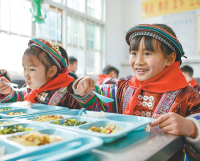 中寨教学点的学生在享用免费营养午餐。