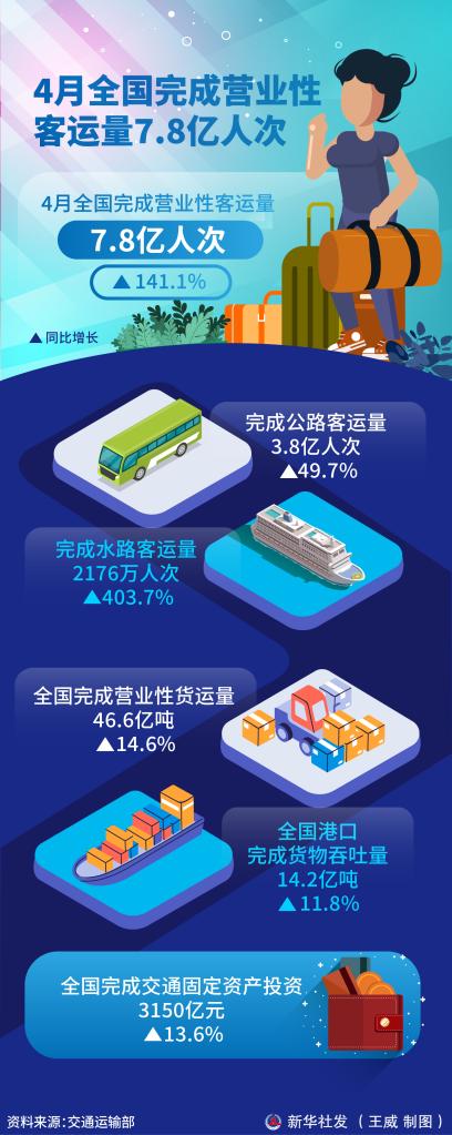 新华社北京5月30日电(记者叶昊鸣)记者30日从交通运输部获悉,4月全国完成营业性客运量7.8亿人次,同比增长141.1%。