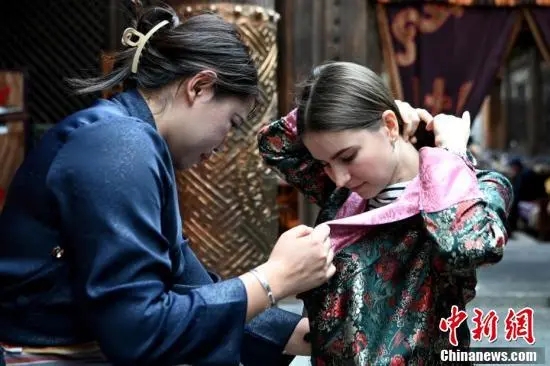 “‘Z世代’画像中国”网络互动活动6月26日在云南省迪庆藏族自治州启动。来自中国、俄罗斯、印度、孟加拉国、泰国、老挝、缅甸等11个国家的“Z世代”青年代表及中国政府官员、高校学者、媒体从业者在世界的香格里拉共话国际传播、文化交流与文明互鉴。启动仪式后,11位“Z世代”青年代表来到独克宗古城内的桑珠别院试穿藏族服饰,体验民族风情。图为工作人员帮助“Z世代”青年试穿藏族服饰。