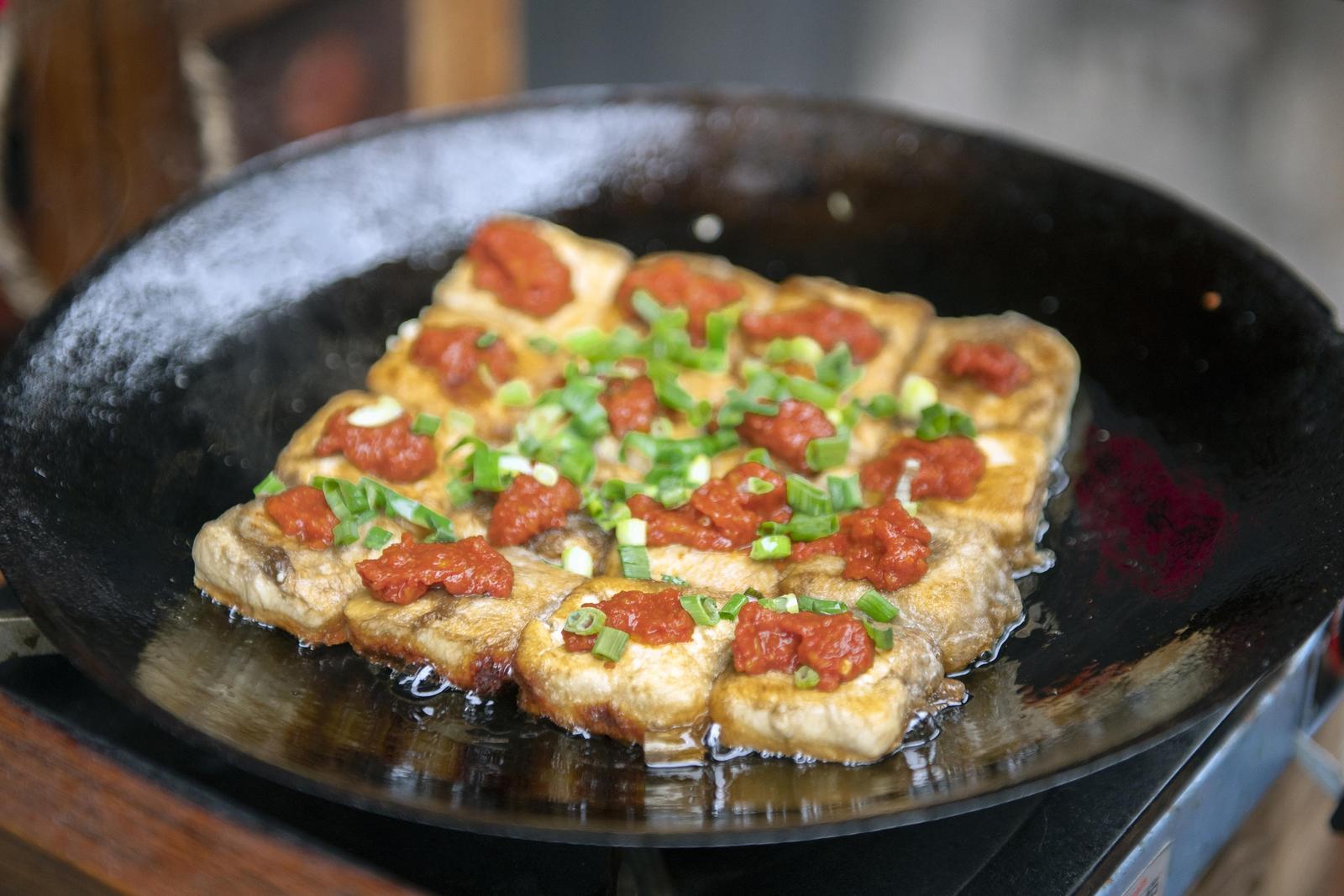 带着丝丝白毛的豆腐经过煎制后,金黄的外壳包裹着绵密软糯的豆腐芯,再蘸上一些当地特制的辣椒酱,让焦香的口感多了几分鲜辣,所谓融合之味、复合口感,体现得淋漓尽致。