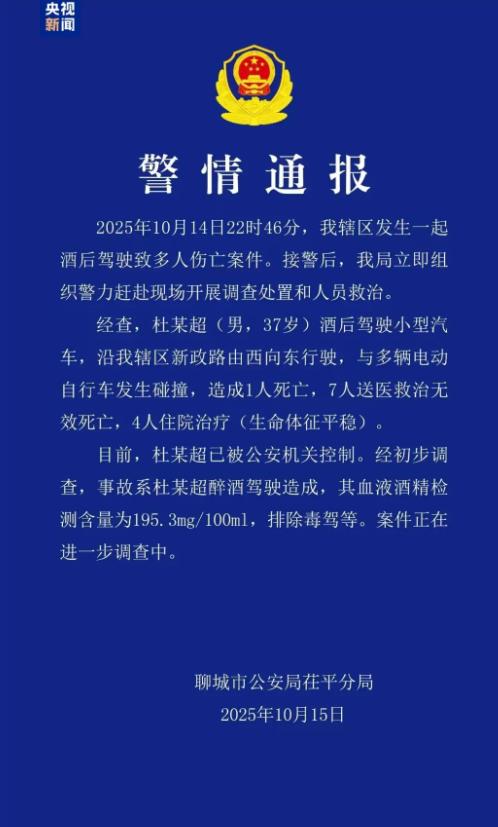 今天,山东聊城公安局茌平分局发布警情通报:10月14日22时46分,辖区发生一起酒后驾驶致多人伤亡案件。经查,杜某超(男,37岁)酒后驾驶小型汽车,沿辖区新政路由西向东行驶,与多辆电动自行车发生碰撞,造成1人死亡,7人送医救治无效死亡,4人住院治疗(生命体征平稳)。