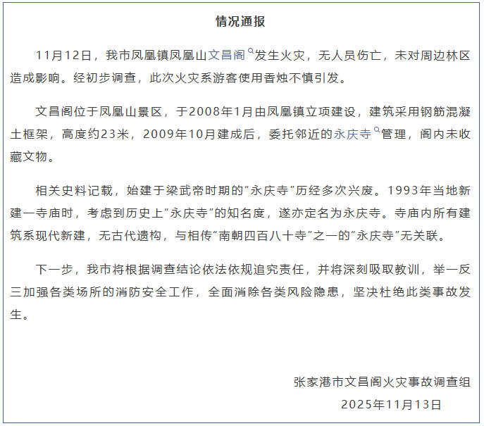 据“张家港发布”公众号消息,11月13日,张家港市文昌阁火灾事故调查组发布情况通报。内容如下: