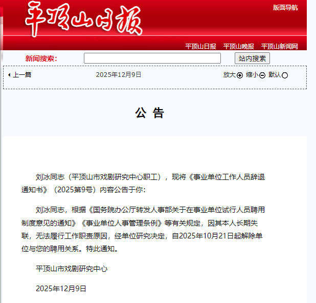 近日,河南平顶山市戏剧研究中心在《平顶山日报》发布辞退公告。全文如下: