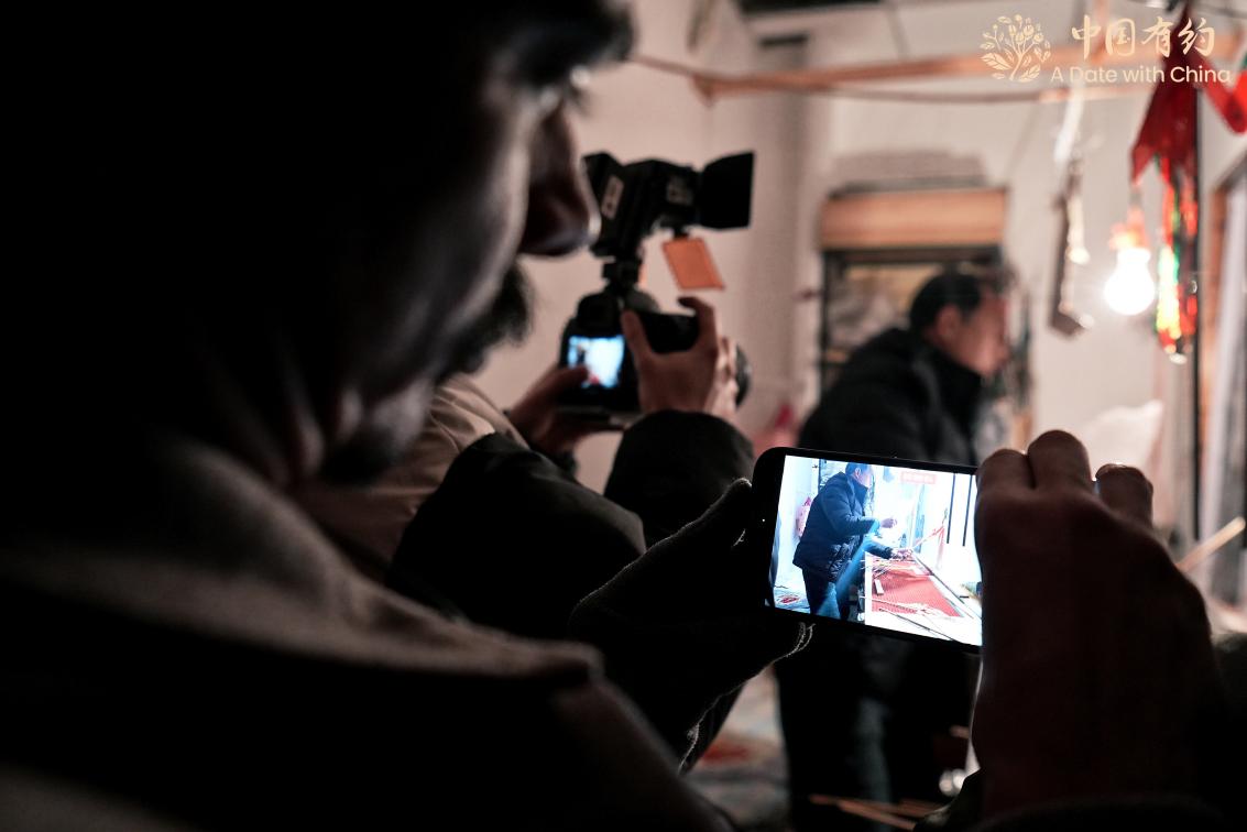 外国朋友用相机记录皮影戏表演。在古文化街,国际采访团的外国朋友们学习了捏泥人,体验了皮影戏表演,还亲手制作并品尝了正宗的天津煎饼,沉浸式感受了一把好吃又好玩的天津范儿。
