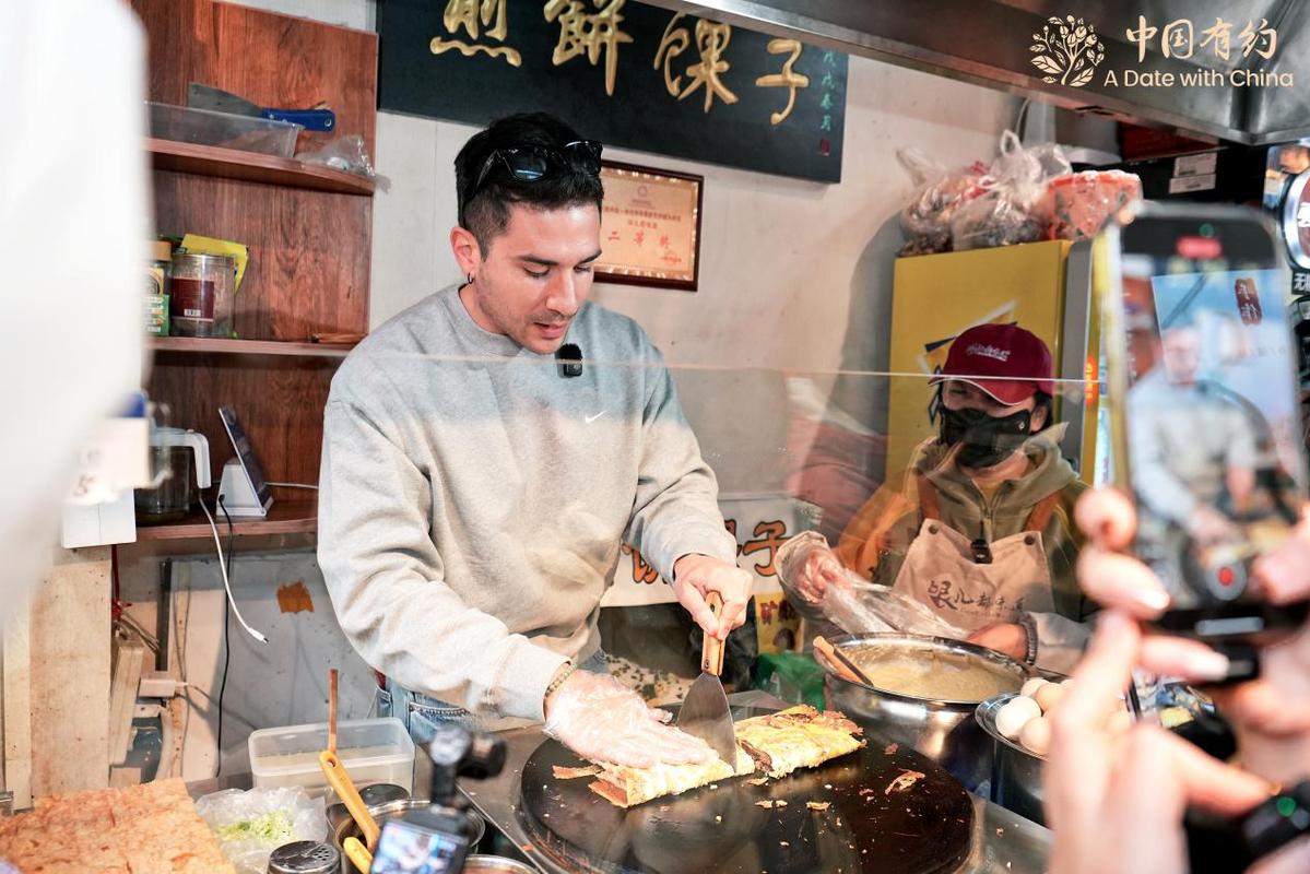 外国朋友在制作天津煎饼。