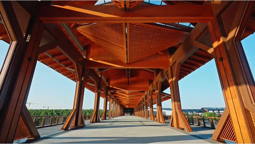 方厅水院于2023年5月开工建设,2025年5月底竣工。它既承担国际论坛与会展等核心功能,宛如长三角的“共享会客厅”,又是面向三地游客的滨水公园。人们漫步连廊,仅15分钟便可无缝跨越长三角。水院四面绿野盎然,廊下时有舟楫穿行,长三角的繁华、江南的诗意汇于碧波清风,向远方无尽绵延。