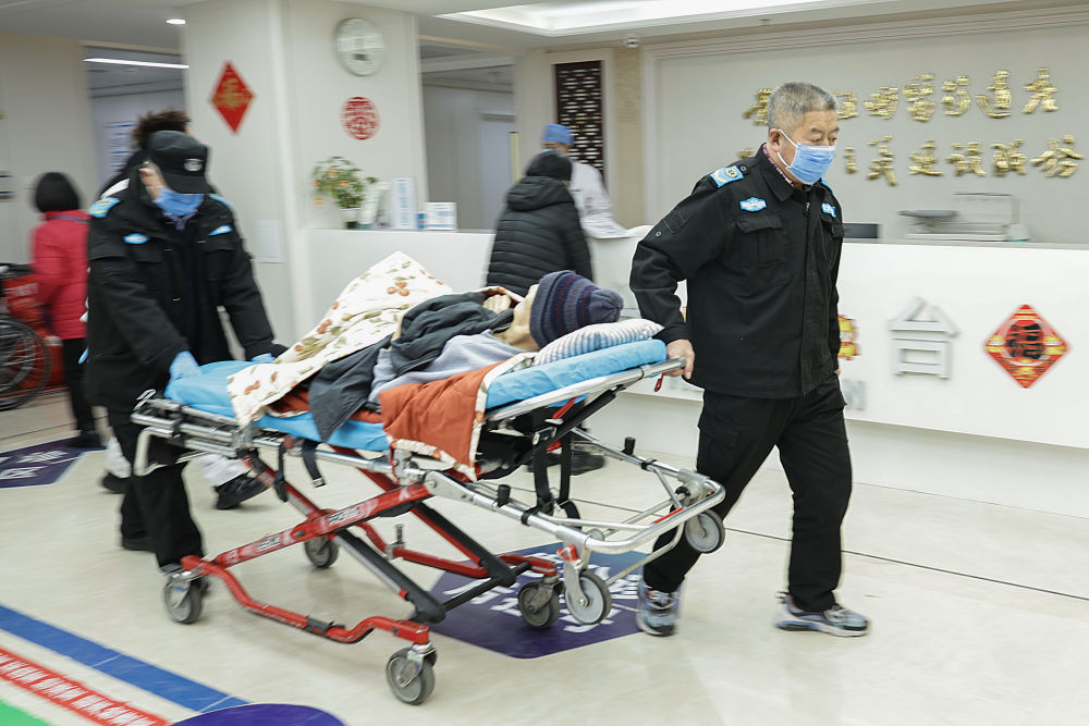 2月12日13时许,医护人员将一名留观室的病人转送到重症监护室。