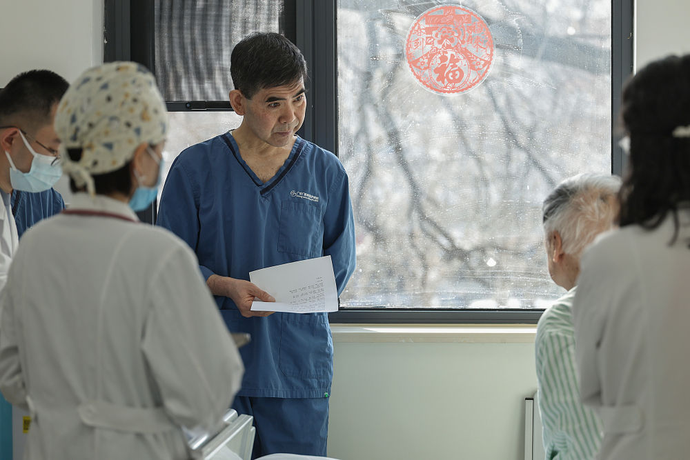2月9日8时许,急诊科资深主任齐文升(右二)在重症监护病房查房。