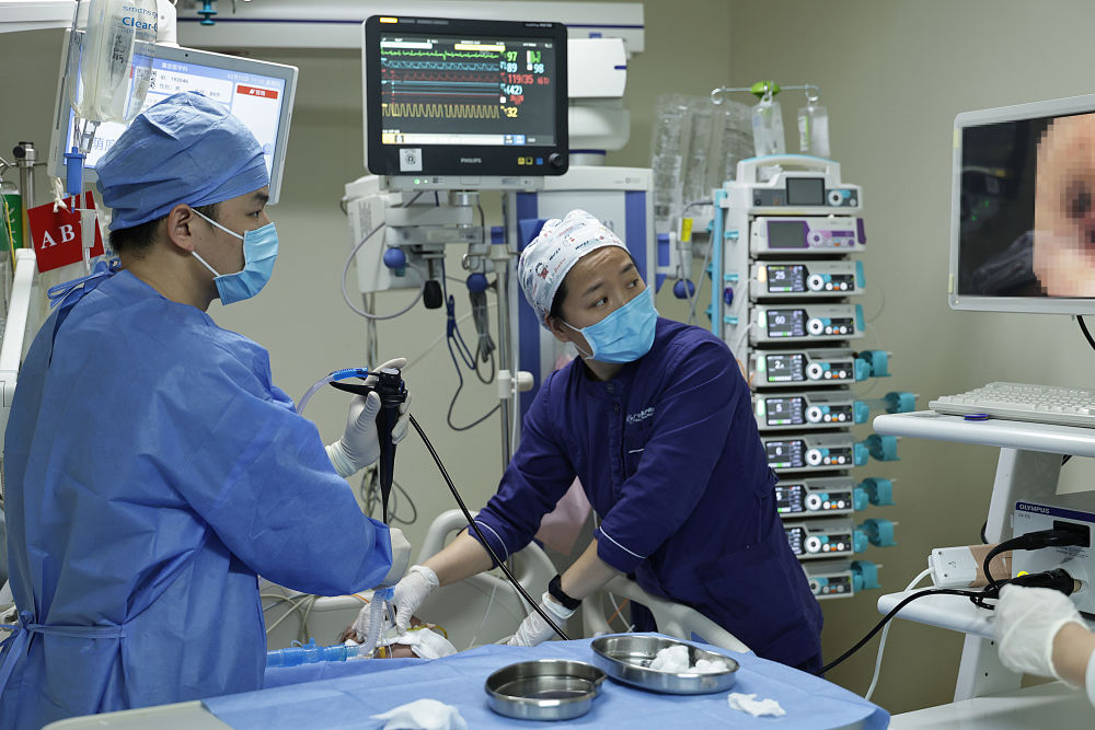 2月12日11时许,医护人员在重症监护室为一名患者进行支气管镜检查。