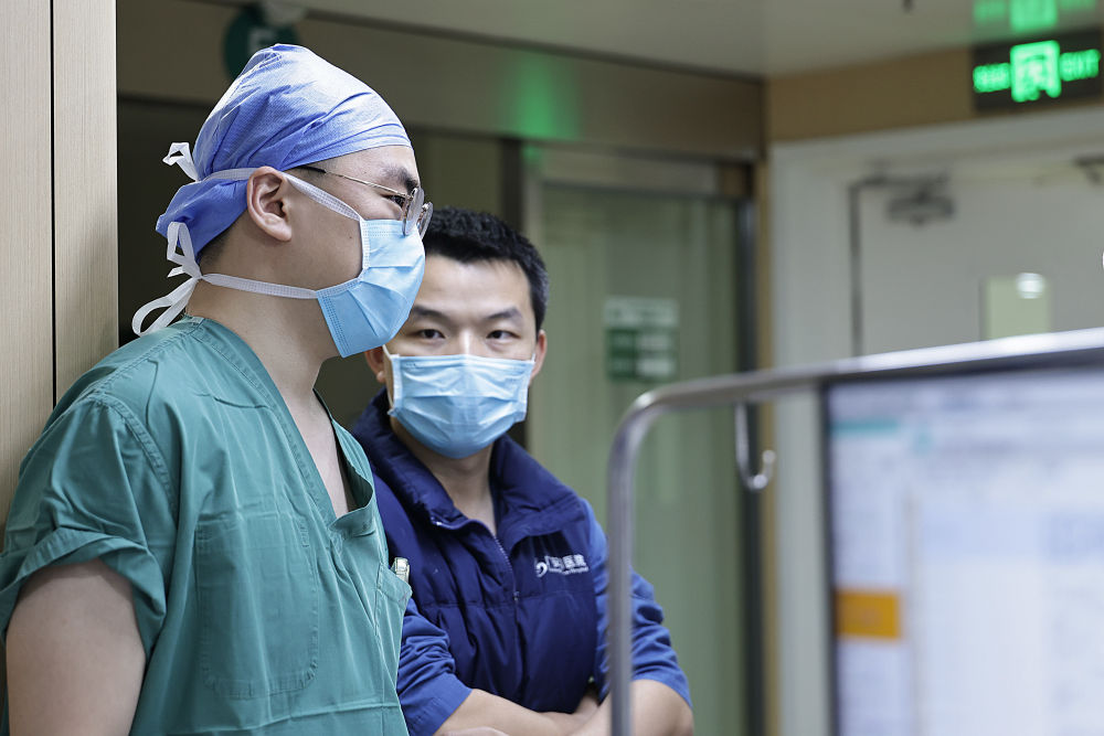 2月4日2时许,一位外科医生(左)和重症监护病房医生交接一名刚刚做完手术病人的病情。