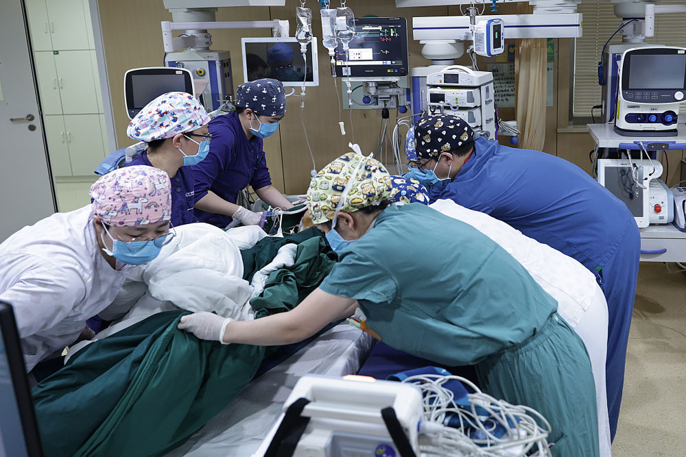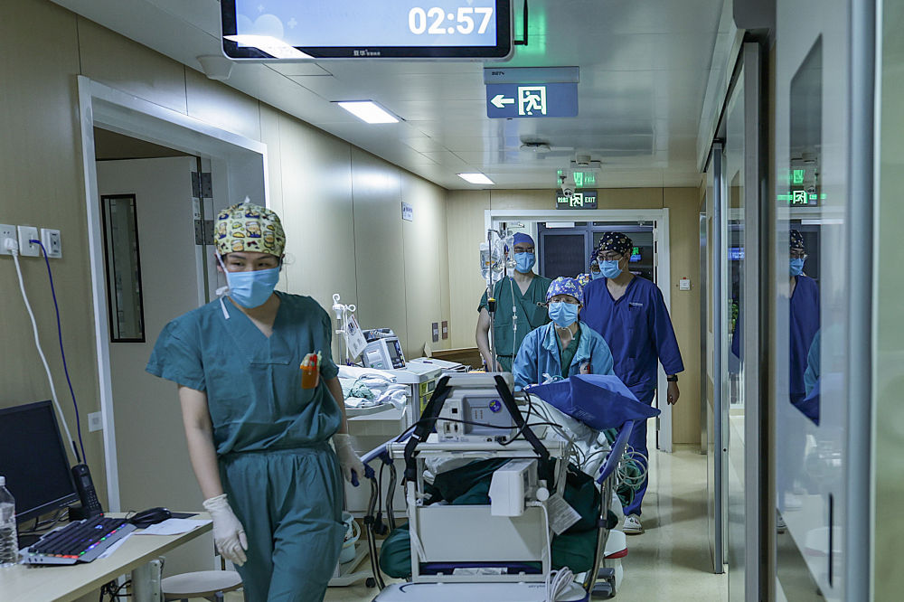 2月4日2时许,重症监护室和手术室护士们合力将一名刚刚做完手术的病人转移到病床上。