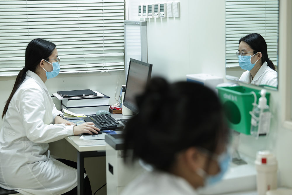 2月9日9时许,急诊科主治医师李琼(右)与学生在办公室进行业务交流。