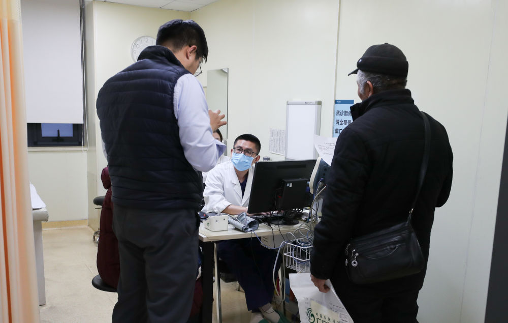 2月5日21时许,两名值班护士在急诊大厅为一名患者测血压。
