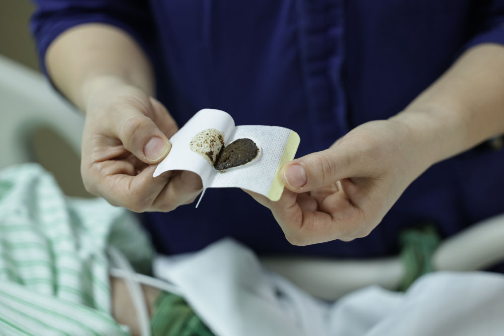 2月12日15时许,一名护士在重症监护室为患者进行中药贴敷治疗。