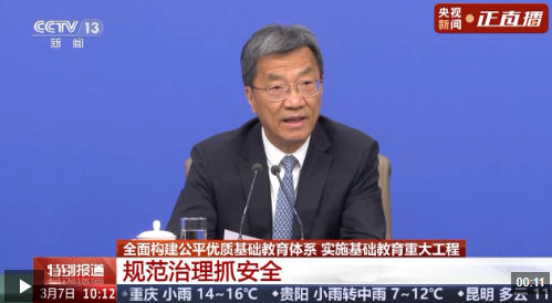 怀进鹏表示,将开展校园安全专项行动,和公安、卫健、市场监管等部门一起,以更严更实的举措,筑牢校园安全防线。持续对违规办学、超时学习、校园欺凌等开展清理整治,深入开展“校园餐”、教辅征订等专项治理。今年教育部将继续开展基础教育规范管理年行动,对违规行为露头就打,严防问题反弹。