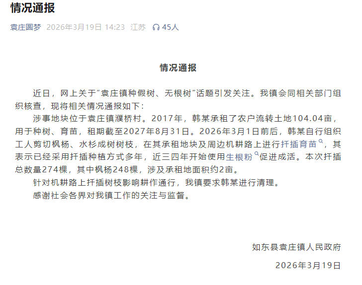 近日,网上关于“袁庄镇种假树、无根树”话题引发关注。我镇会同相关部门组织核查,现将相关情况通报如下: