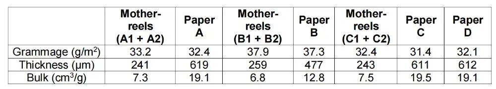 这里有必要对表格数据进行一下说明,Mother reels(A1+A2)表示的是没有经过压花工艺处理的A1、A2两层纸叠在一起的对照组。而Paper A指的是A1、A2经过压花工艺处理之后叠在一起制成的纸(B、C也同理),D和C使用的是同样材质的纸,但压花的图案不一样。