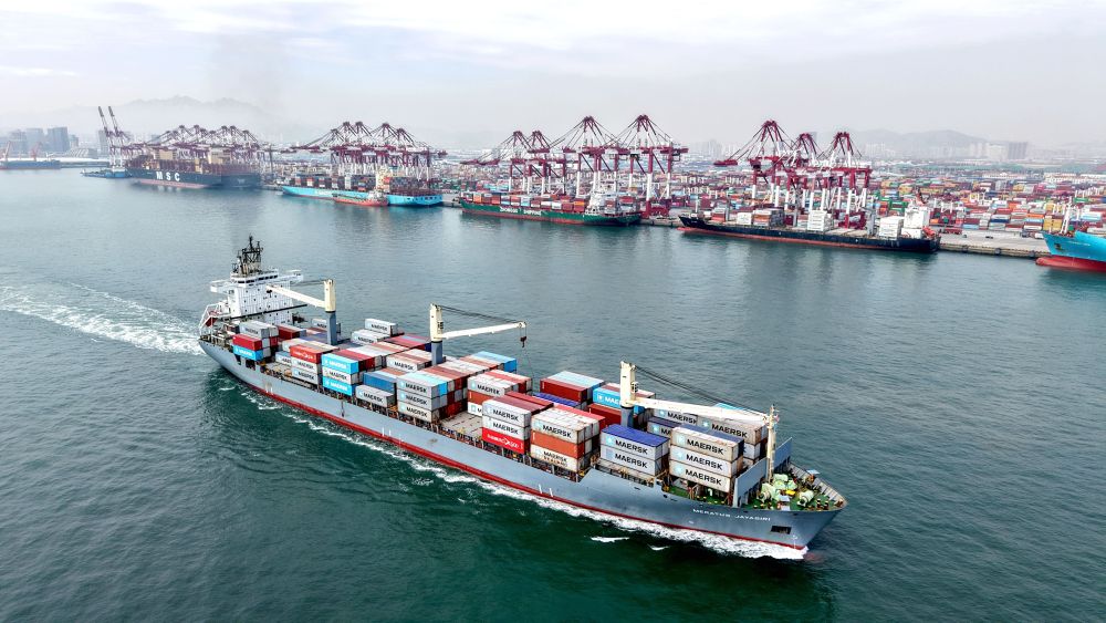 4月14日,在山东港口青岛港,装载外贸集装箱的货轮驶离港口(无人机照片)。新华社发(俞方平 摄)