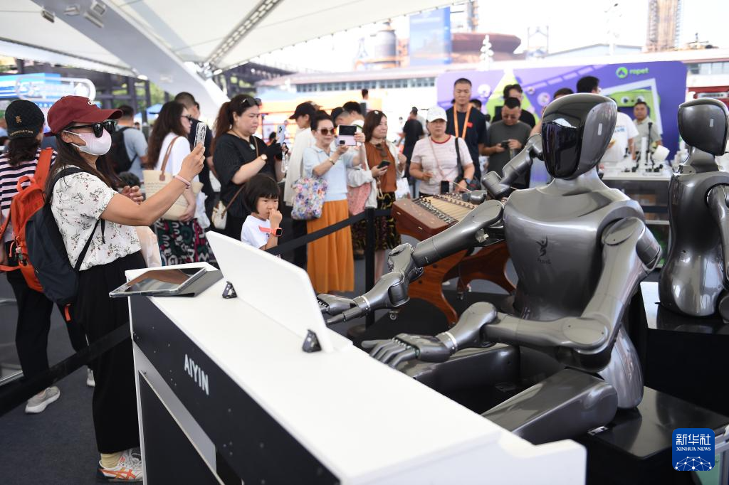 9月11日,在服贸会户外展区,参观者拍摄演奏乐器的机器人。