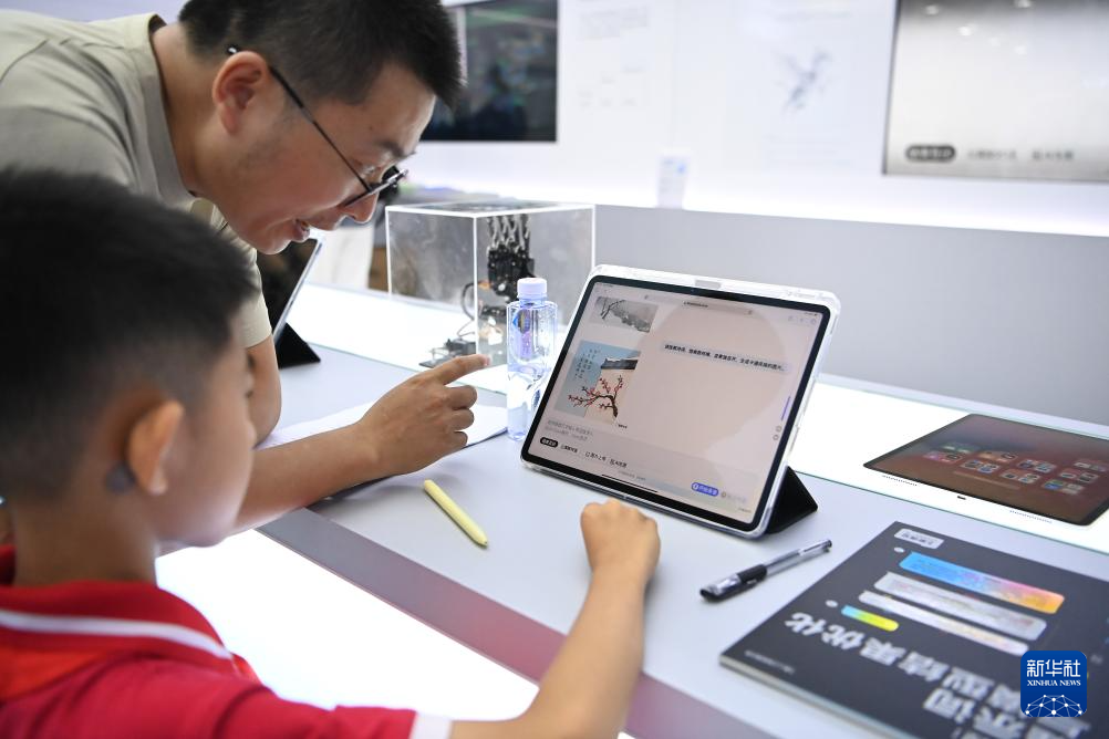 9月11日,在服贸会教育服务专题展区,一名小朋友在猿编程展台观看最新AI教育产品。