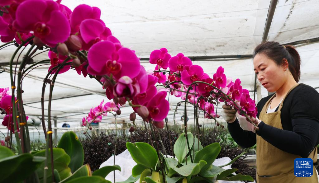 12月23日,在江苏省连云港市农商控股集团农业科技公司花卉大棚,工作人员在管护蝴蝶兰。新华社发(耿玉和摄)