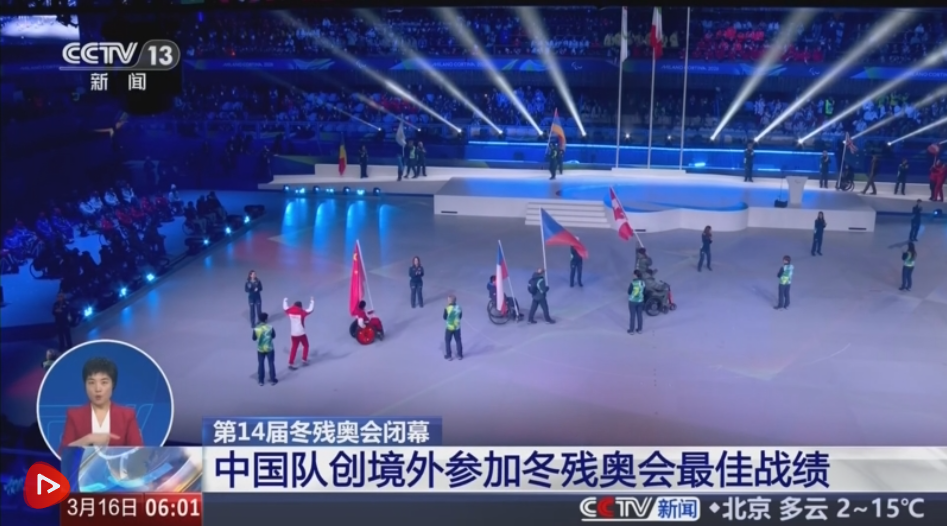 央视网消息:第14届冬残奥会当地时间3月15日晚在意大利科尔蒂纳落幕。在刚刚结束的闭幕式上,冬季两项运动员蔡佳云和轮椅冰壶运动员王蒙担任中国体育代表团旗手。