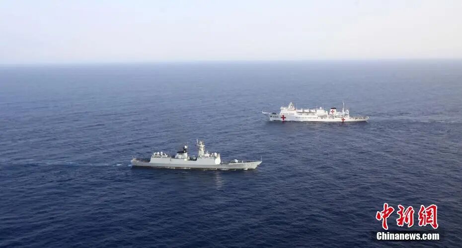 资料图:和平方舟医院船与扬州舰在亚丁湾东部海域会合。中新社发刘洋摄