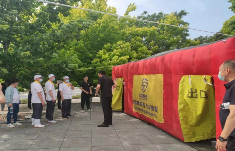 培训讲座结束后,在消防专家引导下,参加培训人员还体验了灭火器、灭火毯等器材的使用,通过火灾逃生模拟体验,把所学知识转化成实战技能。在消防逃生模拟体验屋现场,消防专家利用场景布置和散布烟雾,模拟出逼真的火灾现场。进入此屋,演练者在真实的火场环境中,体验如何在狭小黑暗的空间里进行疏散逃生和自救。