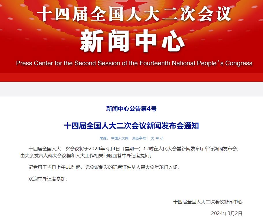 央视网消息:十四届全国人大二次会议将于2024年3月4日(星期一)12时在人民大会堂新闻发布厅举行新闻发布会,由大会发言人就大会议程和人大工作相关问题回答中外记者提问。